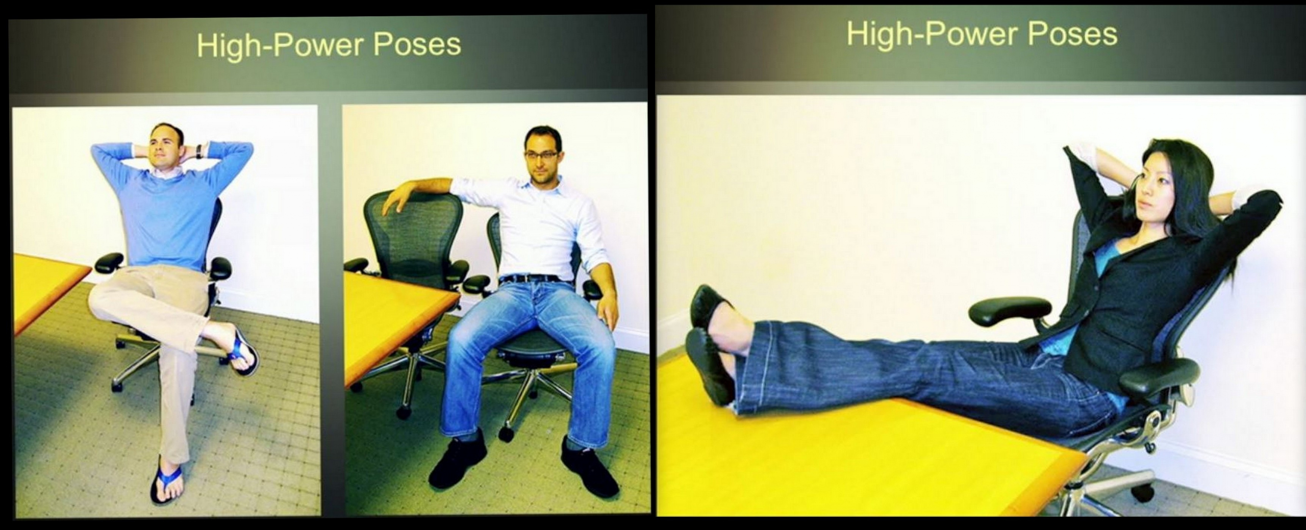 Berühmt sind beim Thema Körpersprache vor allem die sogenannten „(High) Power Poses“. Dabei werden für zwei Minuten bestimmte Körperhaltungen eingenommen: Aufrechtes Stehen oder Sitzen mit geöffneten oder hinter dem Kopf verschränkten Armen (siehe Foto). In einer Untersuchung von Amy Cuddy, nahmen die Versuchspersonen der Gruppe A jene Power Poses ein, während die Personen der Gruppe B die Schultern hängen liessen oder die Arme verschränkt vor sich hielten („Low Power Poses“). Im Anschluss mussten die Personen aus beiden Gruppen – ohne es vorher zu wissen – spontan eine Rede halten. Eine unabhängige Jury, welche nicht über den Versuch Bescheid wusste, bewerteten die Reden im Anschluss. Das Ergebnis war eindeutig: die Reden derjenigen, die zuvor eine „Power Pose“ eingenommen hatten, wurden eindeutig besser bewertet.
