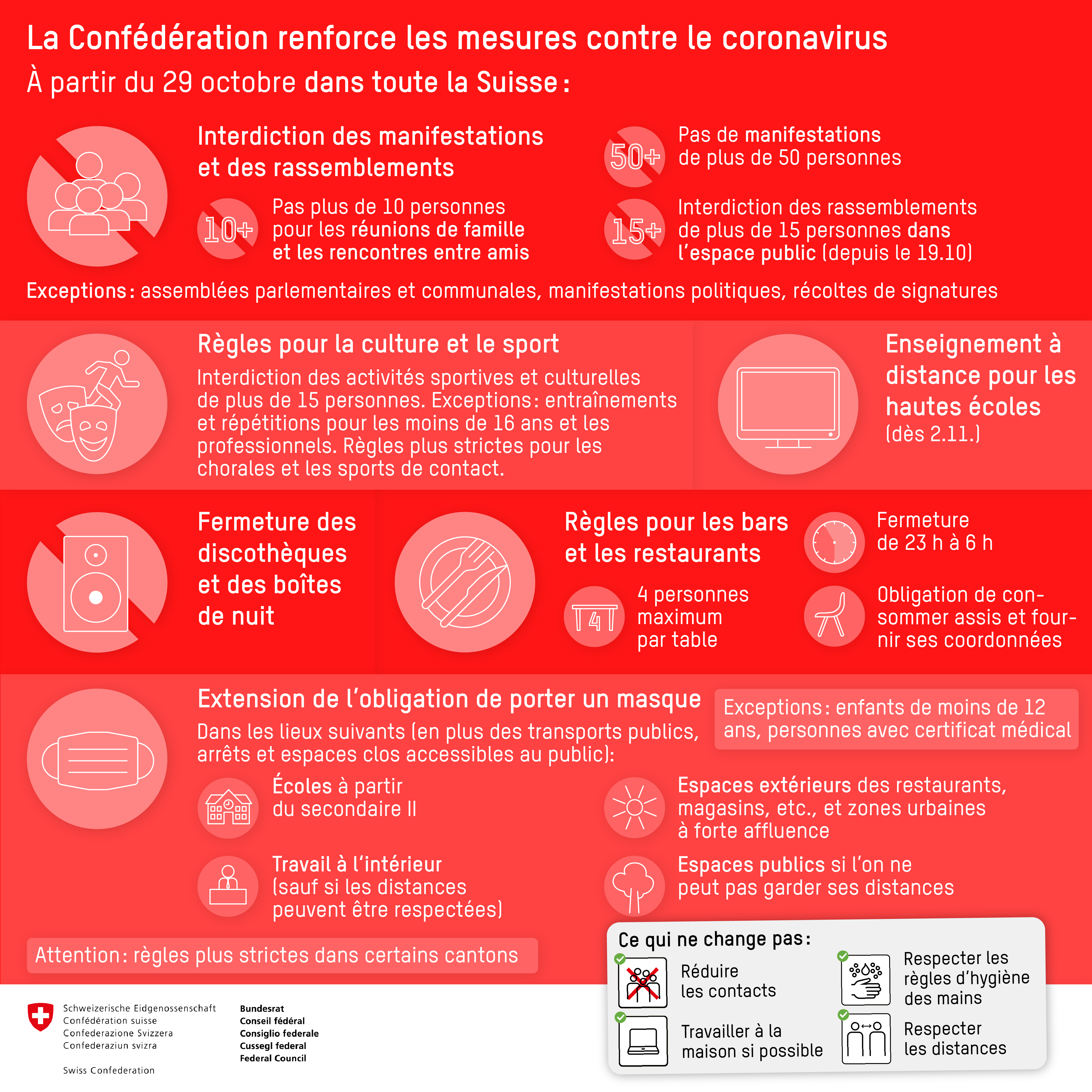 Consignes et recommendations du Conseil Fédéral - 29.10.2020