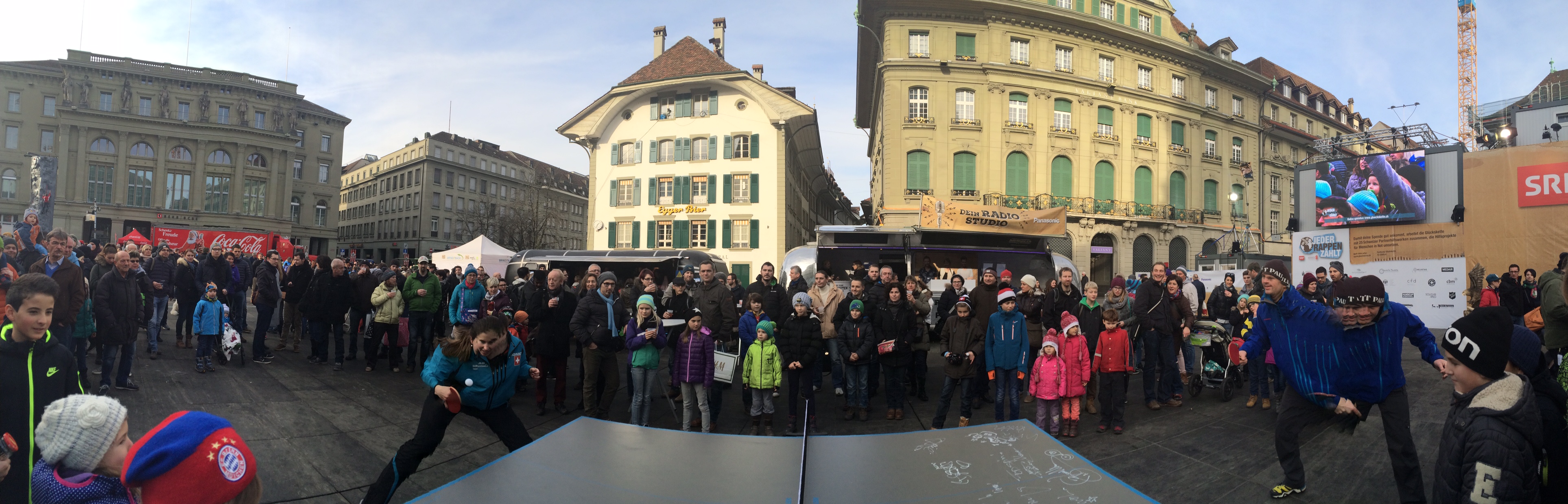 Die Rekordsumme von über 100’000 Franken für „Selfies mit Xherdan Shakiri“ konnte Rahel Aschwanden nicht ganz erreichen, dennoch spendeten am Sonntag mittag zahlreiche Besucher des Bundesplatzes insgesamt 213 Franken, um einmal „gegen“ die Schweizermeisterin Tischtennis spielen zu dürfen.